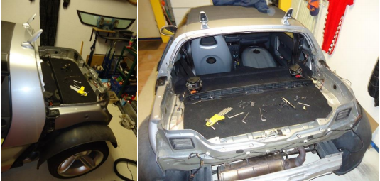 Monteer de zijruiten, kofferklep. afdekpanelen en vergeet de gordels niet die we eerder los hebben gehaald.