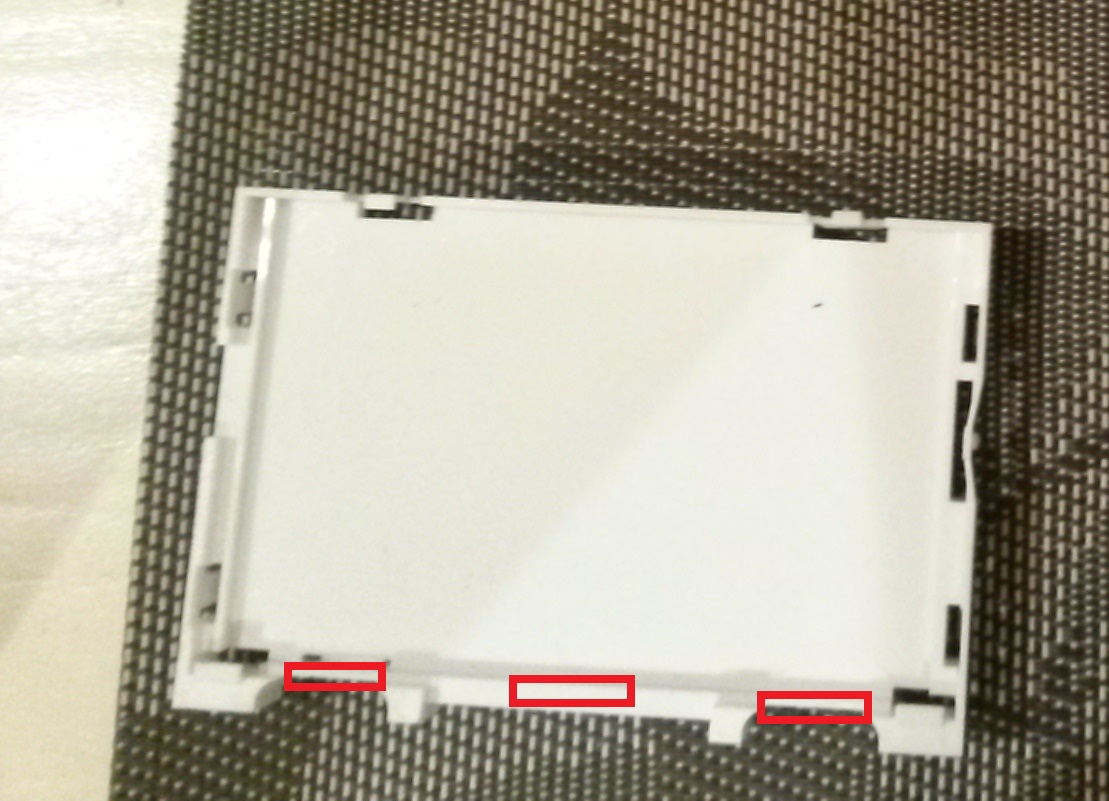 Als je alles uit elkaar hebt gehaald maak dan 3 inkepingen ter grote van de nieuwe LEDjes in het kunststof frame. (zie rode rechthoeken)